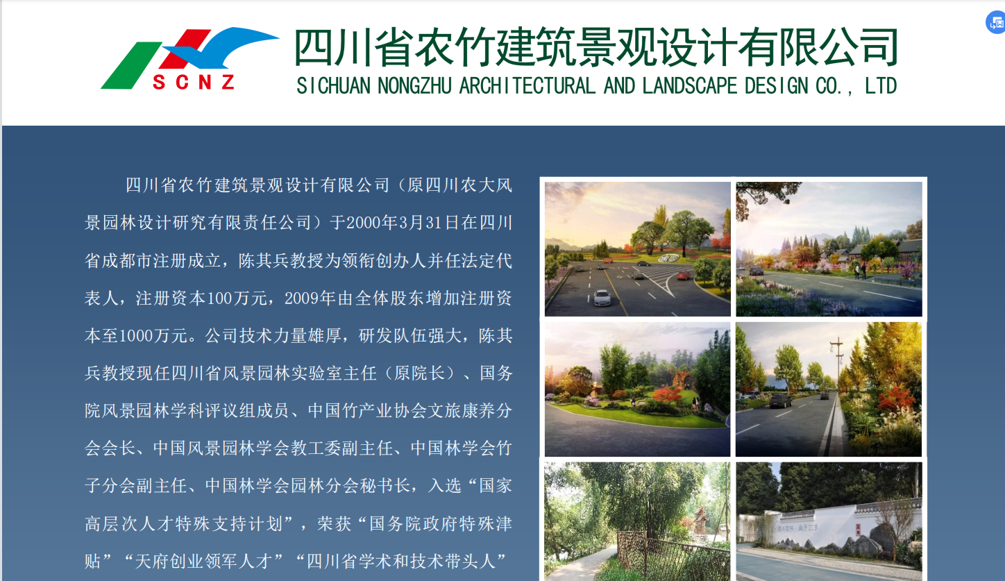 四川省農竹建筑景觀設計有限公司(原四川農業大學園林環境藝術設計研究所)依托于以培養風景園林高級人才著稱的四川農業大學風景園林學院與成都科學院園林研究所。四川省農竹建筑景觀設計有限公司成立于2000年,隸屬于以培養園林高級人才著稱的“211”重點建設高校四川農業大學風景園林學院,集科研教學、環藝、園林綠化規劃設計、休閑農業規劃、施工、監理、苗木生產培育以及培養園林高級人才等為一體的大型綜合園林科研開發實體,具有風景園林工程設計專項甲級、林業規劃設計乙級、建筑工程設計乙級資質。